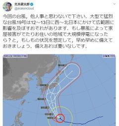 荒木健太郎さんは9日午前7時すぎ、自身のツイッターを更新。<いまのうちに台風への備えを確認しておいて下さい.大型で猛烈な台風19号が北上しており,今週末の12~13日に西~北日本の広範囲に影響を及ぼすおそれ.まだ台風に備えるための時間があります.備蓄や非常用持ち出し袋,避難場所や避難経路などをチェックしておきましょう.最新の台風情報を要確認です>