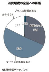 一方で「プラスの影響がある」と答えた企業は1%にとどまった。事務用機械などの業種が該当し「機械の料金変更で売り上げが増える」(東京都の事務用機械器具卸売)といった声が挙がった。