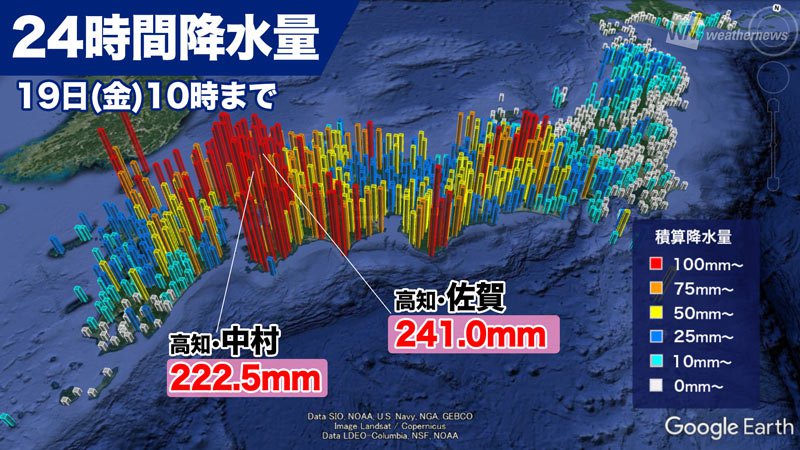 四国の太平洋側では、今日19日(金)10時までの24時間雨量が200mmを超えている所があり、すでに地盤の緩んでいるおそれがあります。