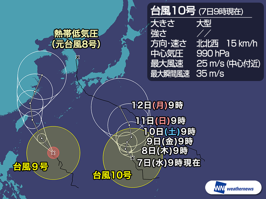 日本付近には8号・9号・10号と3つの台風がありましたが、7日(水)9時に8号が熱帯低気圧になりました。今後、9号・10号のダブル台風の動向に注意が必要です。