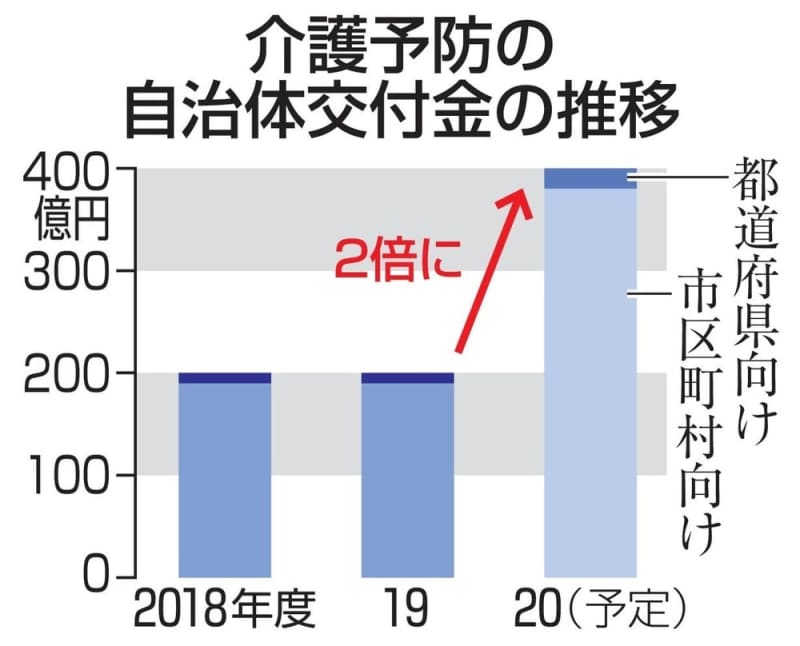 政府が年末に編成する2020年度の当初予算案で、介護の予防や自立支援に成果を上げた自治体に手厚く配分する交付金を、現在の2倍の400億円程度へ大幅拡充させることが分かった。認知症予防や要介護度の維持・改善に向けた取り組みを自治体間で競わせ、介護費の膨張を抑える狙いがある。